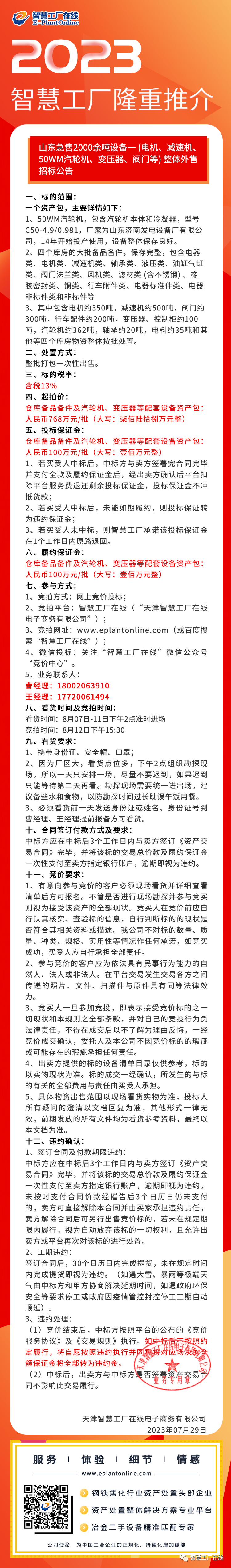 【招标公告】768万元起拍!山东急售2000余吨设备一批(电机、减速机、50WM汽轮机、变压器、阀门等)整体外售招标公告