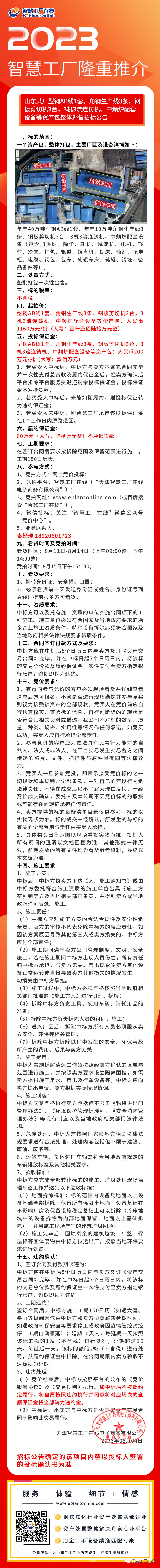【招标公告】1160万元起拍!山东某厂型钢AB线1套、角钢生产线3条、钢板剪切机,3机3流连铸机、中频炉设备等资产整体招标公告