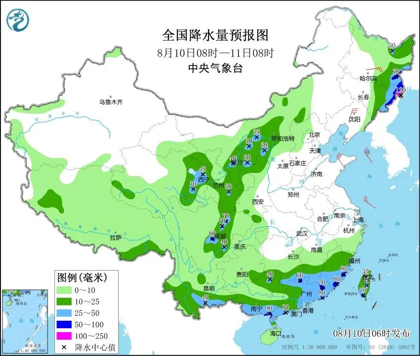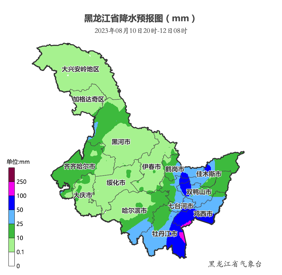10日8时至11日8时,吉林东北部、黑龙江东部将有大到暴雨,吉林东北部的局部有大暴雨(100-120毫米)。