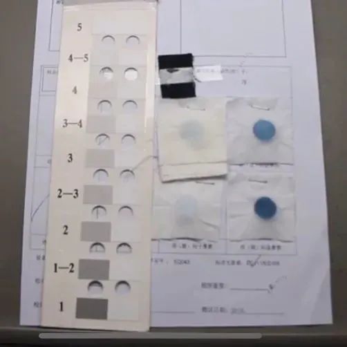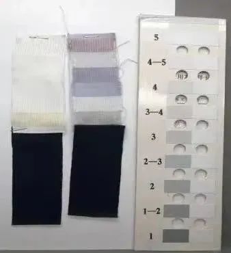 针对于这些色牢度试验的评级,它们都是以一块原样和一块未经试验的贴衬织物作为参照样,然后来评定试样的变色和贴衬织物的沾色。