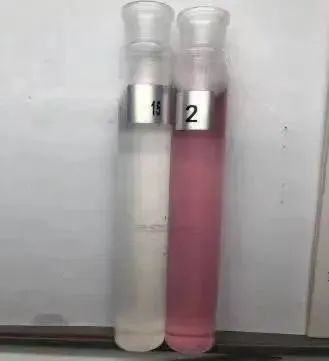 针对于皂洗试验后(参照FZ/T 73020-2019)洗液沾色的评级,在试验结束后,评级需在15min内完成。将皂液去除杂质后倒入比色管中,以未经洗涤且与试验温度相同的皂液作为参照样,在D65光源下,以白色纸板为背景,用沾色灰卡来评定洗液的沾色程度。
