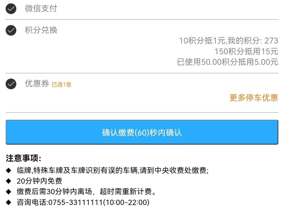 停车缴费时勾选即可自动减免对应停车时长,还可勾选积分抵扣,50 积分兑1小时停车、100 积分兑2 小时停车。