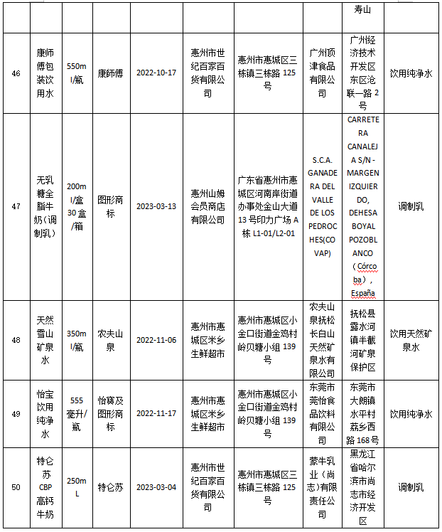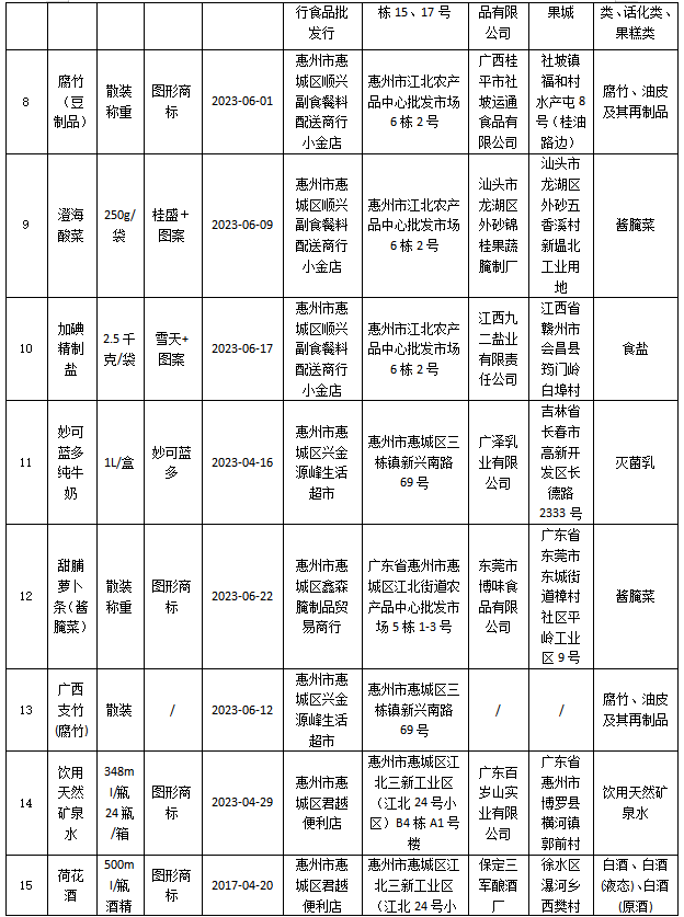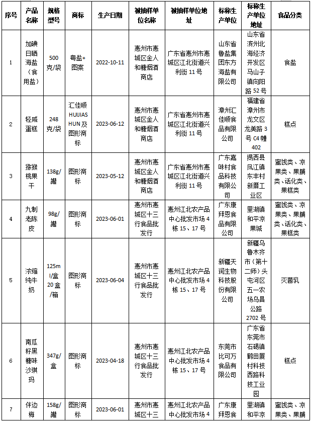 近期,惠州市市场监管局通过官方微信公众号组织了“聚民意、汇民智、凝民心!食品安全‘你点我检’邀您一起”投票活动,并对选出的“最想抽检的10类食品品种”【白酒、白酒(液态)、白酒(原酒)、腐竹、油皮及其再制品、糕点、酱腌菜、蜜饯类、凉果类、果脯类、话化类、果糕类、灭菌乳、食盐、调制乳、饮用纯净水、饮用天然矿泉水】进行监督抽检,共50批次,全部合格。此次抽检主要针对超市、批发市场、商场和小食杂店等主要消费量较大的聚集地。