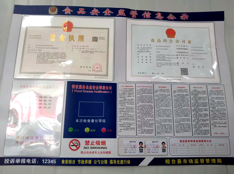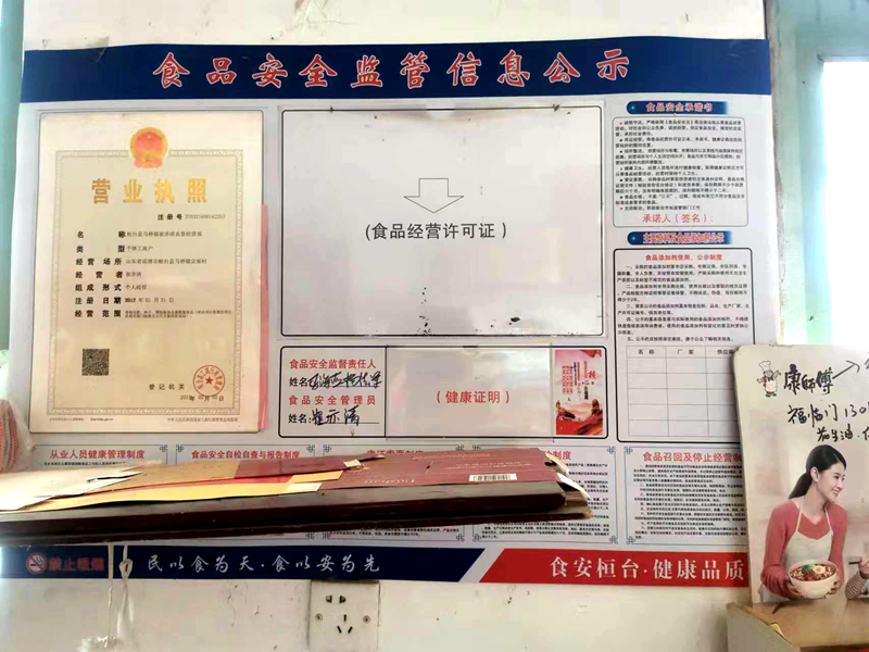 经营地址:桓台县马桥镇工业路与红辛路路口南三十米路西1.证照齐全并上墙公示,从业人员健康证件齐全且公示。