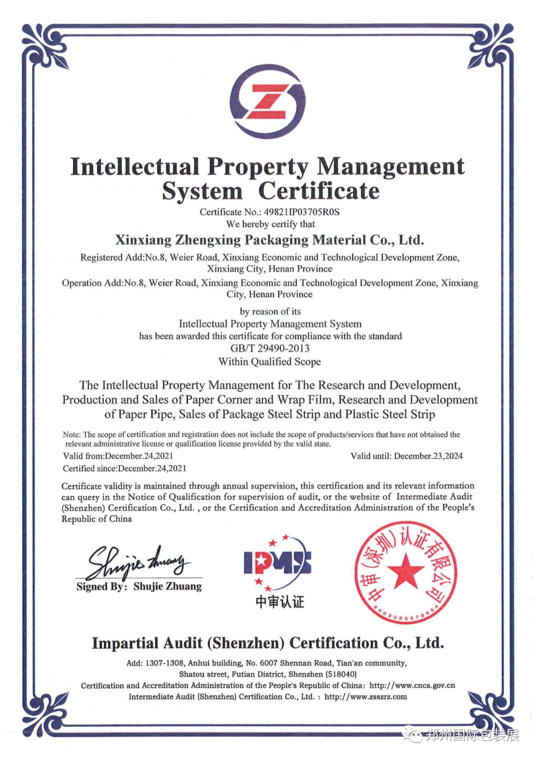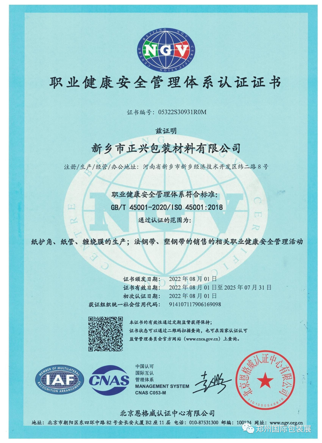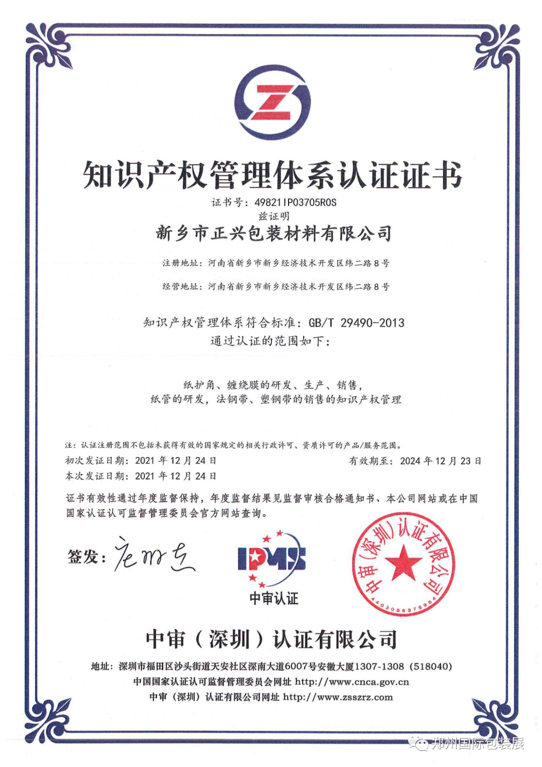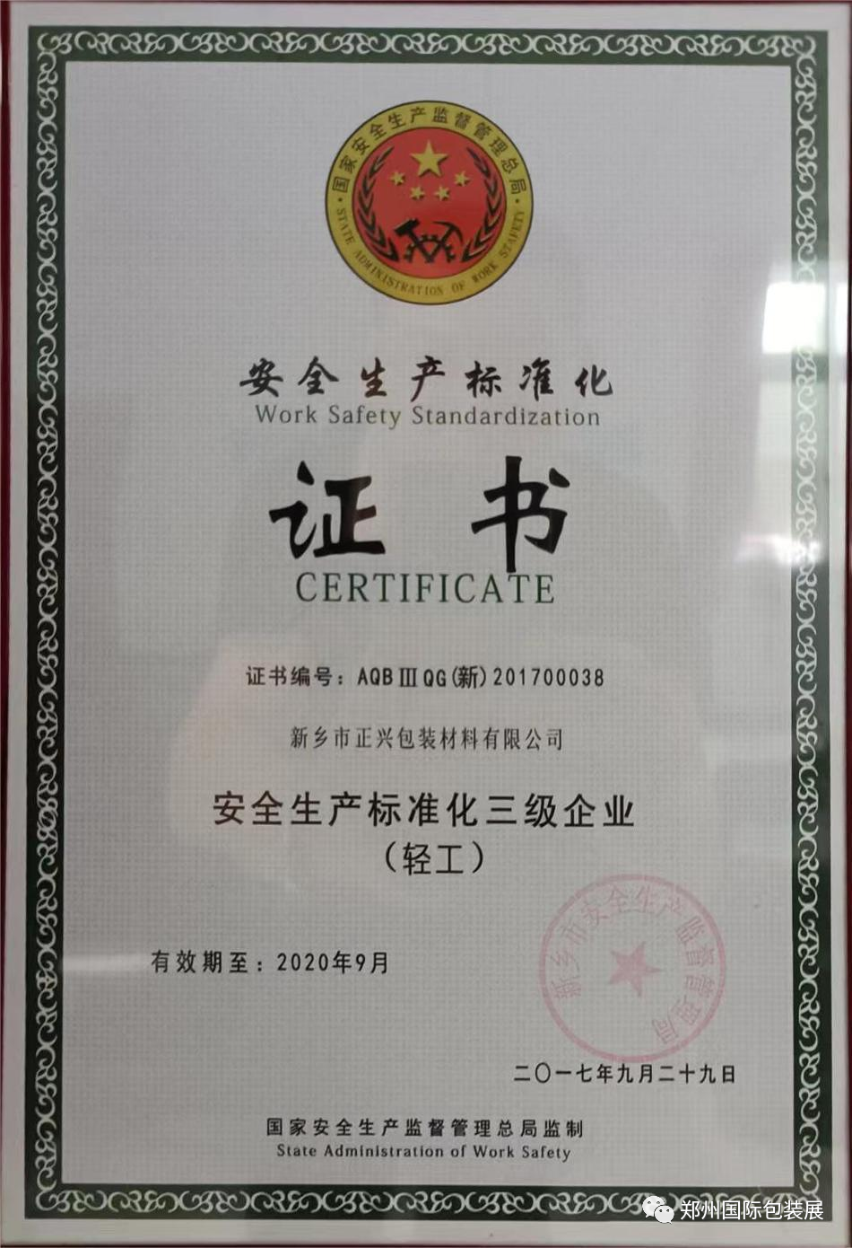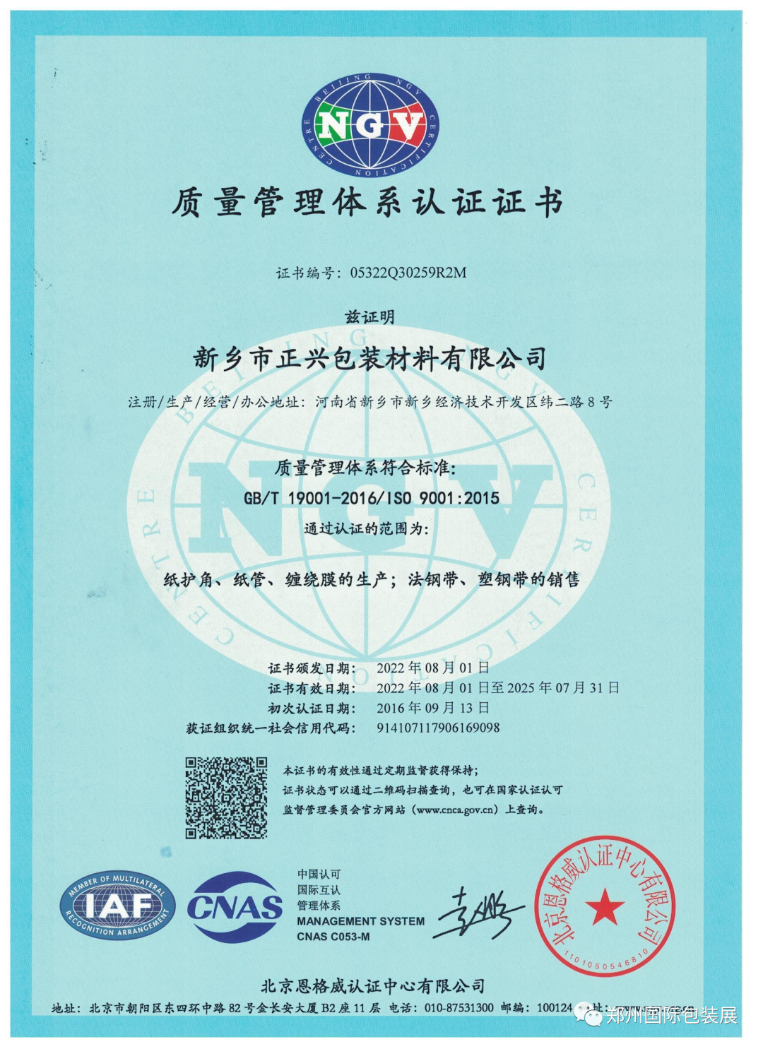 目前公司已经通过 ISO9001:2015 质量管理体系认证,ISO14001:2015 环境管理体系认证,ISO45001:2018 职业健康安全管理体系认证,GB/T 29490-2013 知识产权管理体系认证,通过《安全生产标准化企业》评审,通过《安全生产双预防企业》评审,2022 年通过国家级科技型中小企业评定,通过新乡市物流环保包装材料工程技术研发中心审核,成为河南省包装技术协会第三届理事会理事单位。