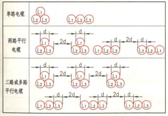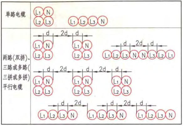 交流单芯电缆或分相后的每相电缆包括预分支电缆的分支以及单芯矿物绝缘电缆等,在敷设时应有科学的排布方式以减少涡流造成的能量损失和电缆绝缘损坏,或采取分隔磁路的措施或采用非导磁材料的支撑支架或卡具等。