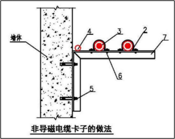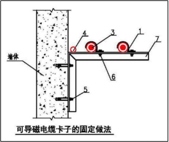 说明:1-导磁卡子,2-非导磁卡子,3-单芯电缆,4-接地导体,5-金属膨胀螺栓,6-螺栓。