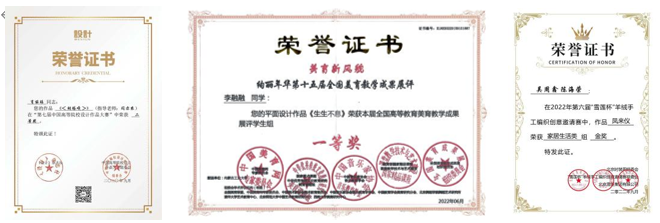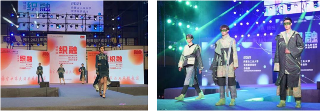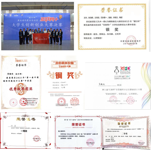 近三年,获自治区级“互联网+”大学生创新创业大赛银奖1项;学生在全国纺织服装设计大赛、大学生科技创新项目、创新实验项目等各级各类学科竞赛奖百余项。“轻纺·颂”服装动态作品展已成为校园文化活动的特色品牌,为活跃校园艺术文化氛围,发挥 “以美育人”的功能作用做出了积极的贡献。