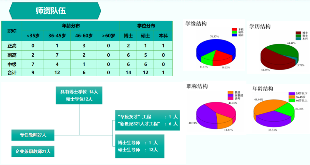 学院现有教职工54人,其中教授5人,副教授13人,具有博士学位教师16人,硕士学位教师32人,研究生导师21人。内蒙古“草原英才”工程青年创新人才1人、“新世纪321人才”8人。柔性引进国内知名大学学者1人为学院特聘教授。已形成一支以高层次人才为引领,以青年教师为主力,博士化程度不断提高,教学、科研能力稳步增强的高水平师资队伍。