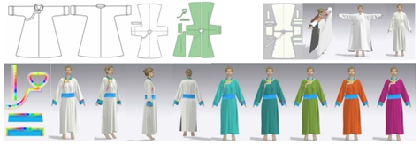 (2)数字化服装设计方向:先基于三维人体的造型,完成服装效果设计;结合所设计服装造型完成款式设计;结合款式完成结构设计;再将曲面展为平面纸样,方便纸样转化为缝制裁片的各种工艺设计及自动放码等处理;重新缝合成虚拟的三维服装进行悬垂模拟,检验服装的合身性,与二维工艺结合,使服装打板更快捷、方便、直观。