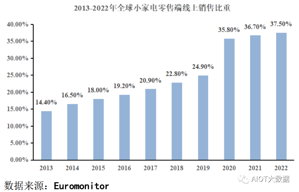 小家电产品由于单价较低、便于物流配送、无需专业安装等特性,某种程度上还承载着消费者对美好生活的向往,契合电商平台消费行为特征。近年来小家电产品线上消费较为亮眼。根据Euromonitor数据显示,2022年全球小家电零售端的线上销售占比正在快速提升,已从2013年的14.00%上升到2022年的37.50%。当前,在电商平台加速发展的趋势下,小家电的线上销售比例有望进一步提升。