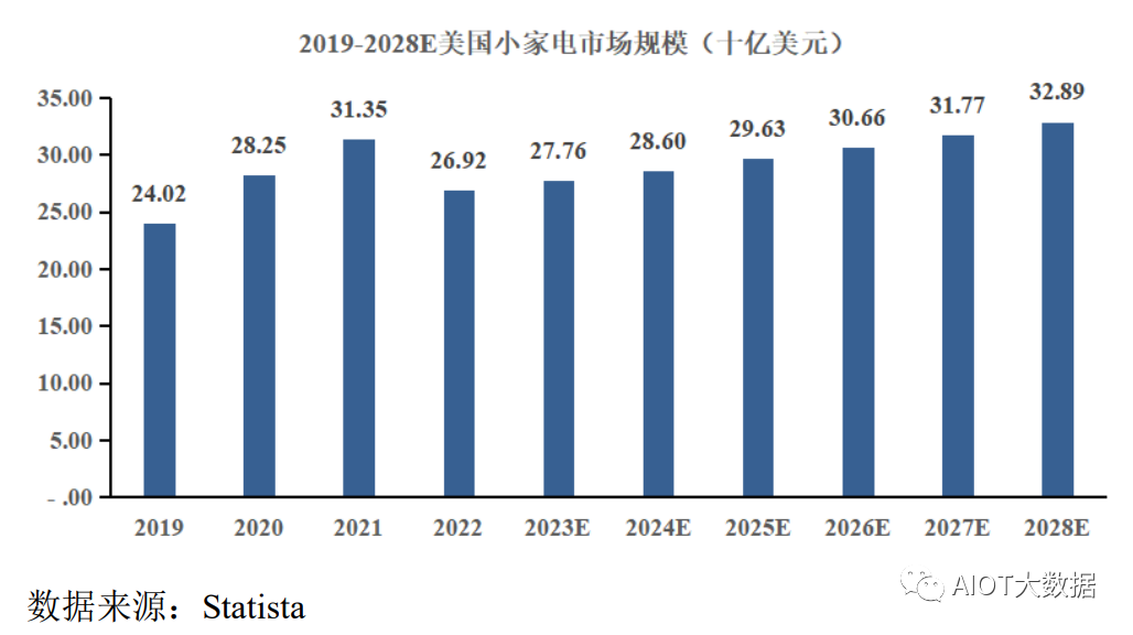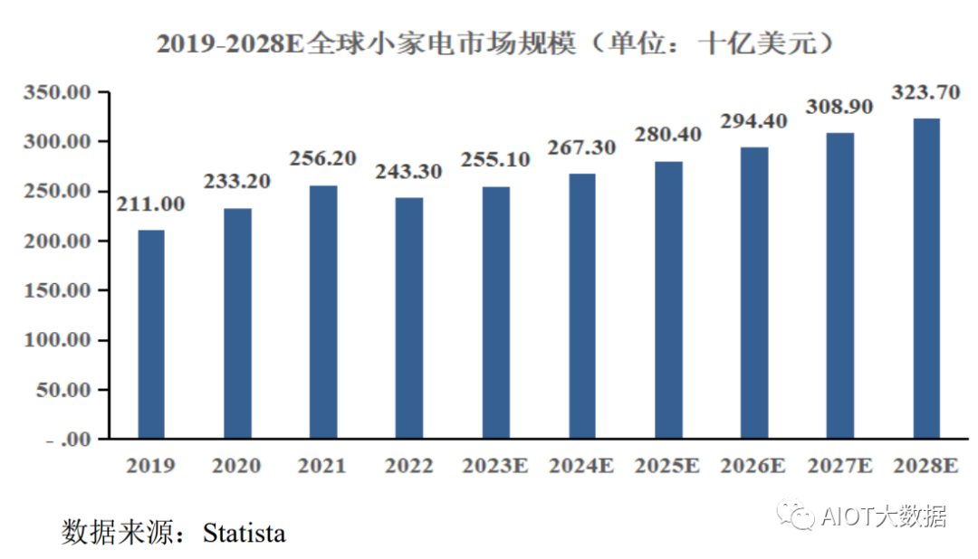 根据Statista统计数据显示,2022年全球小家电市场规模达到2,433.0亿美元,较2021年有所回落,但随着市场对不利因素的消化以及海外库存水平的逐步去化,预计2023年起需求将呈现回暖趋势。未来,全球小家电市场规模有望回归常态化持续增长,预计2028年全球小家电市场规模将达到3,237.00亿美元。