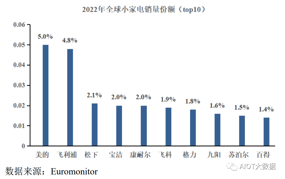 小家电行业涉及到的产品品类较为繁杂,目前产品种类仍在不断增长,使得本行业呈现高度碎片化和细分化特征;同时,各大品牌商积极追求专业化发展的经营模式,主要专注于某一细分赛道展开竞争。因此,现阶段全球小家电行业的市场份额较为分散,行业集中度仍有较大的提升空间。据Euromonitor数据显示,2022年全球TOP10小家电品牌的市场份额合计仅为24.10%,其中排名前三的企业为美的、飞利浦和松下,市场占有率分别仅为5.0%、4.8%和2.1%,可见行业内企业多而分散,头部企业的规模优势并不明显,市场竞争较为激烈。