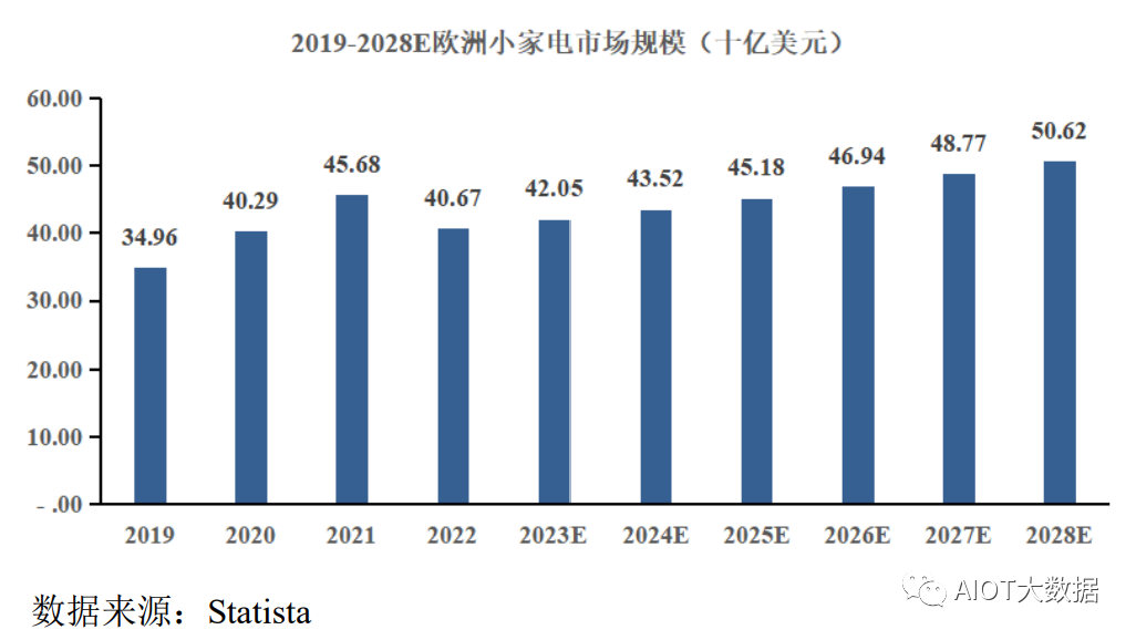 根据Statista统计数据显示,2022年欧洲小家电市场规模达到406.70亿美元,相比于2021年有所下降,但预计2023年欧洲小家电市场需求继消化不利因素后将出现需求回暖趋势,未来几年将回归常态化增长。预计2028年欧洲小家电市场总体规模将达到506.20亿美元,整体呈现增长态势。