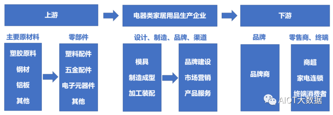 电器类家居用品生产企业通过对金属原料及五金配件、塑胶原料及塑胶配件、电子元器件等原材料进行设计、加工、生产、装配,并最终销售给客户,产业链情况如下图所示: