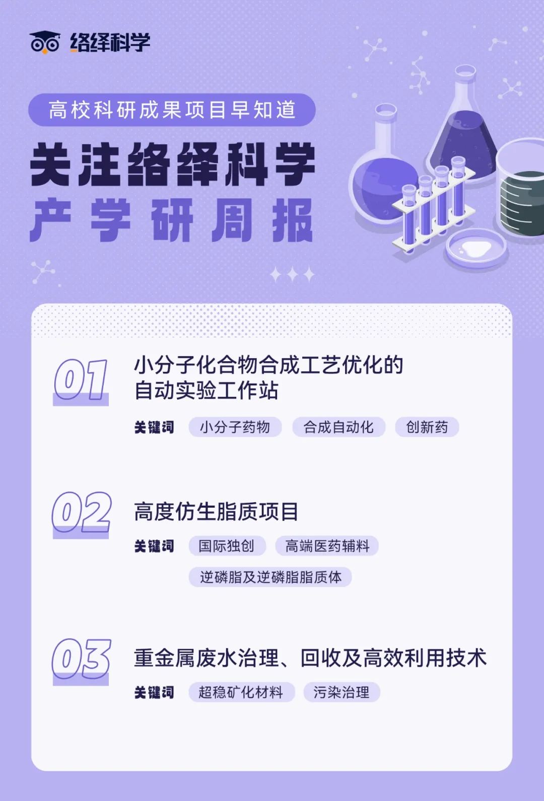 为了打破科研与产业的对接壁垒,促进科研成果有效地从学术界走向产业界,络绎科学每周将发布成果转化周报。通过成果转化周报,我们可以及时了解到最新的科研成果和项目,与高校科研界保持紧密的联系,同时也促进高校科研成果与产业生态建立更紧密的链接。本期,我们将推荐三个高校科研成果项目,如果您对本文提到的科研成果转化项目感兴趣的话,欢迎与我们联系。Research Projects Recommended