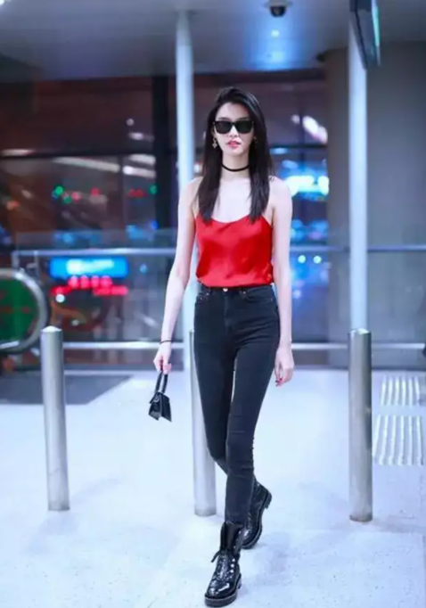 红色自古以来就是一种代表着活力、激情和高雅的颜色,奚梦瑶选择红色真丝吊带作为主打,完美展示了女性的优雅与魅力。真丝的质地柔软,能够突出女性的温柔气质,与小黑裤的硬朗风格形成了有趣的对比。小黑裤的修身效果更是强调了奚梦瑶修长的腿型,呼应了超模的身材特质。马丁靴的加入则平衡了整体造型,赋予了一种中性的酷帅感。不得不说,这一搭配巧妙地融合了柔与刚、古典与现代的元素,既符合当今流行趋势,又不失个人特色。奚梦瑶通过这样的穿搭,再次证明了自己不仅是T台上的焦点,更是街头时尚的引领者。