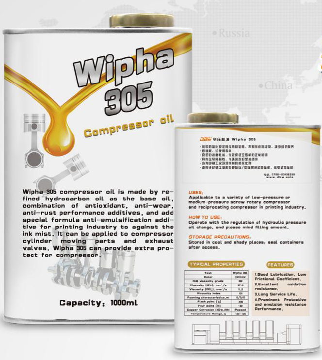 Wipha 305压缩机润滑油是以精制烃类油为基础油,并加有抗氧、抗磨、防锈的添加剂,并针对印刷工业有油墨雾化的特点,特别增加了抗乳化添加剂。特别适用于压缩机汽缸运动部件及排气阀的润滑。Wipha 305,其独到的配方,能够给空压机提供特别的保护。