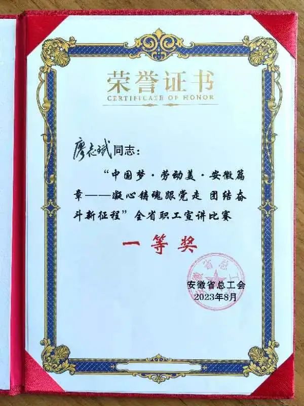 本次比赛由安徽省总工会举办,分为线上初赛、线下决赛、云宣讲三个部分,采取“线上+线下”方式进行,共有20名选手进入线下决赛。安徽省总工会党组成员、副主席朱颖出席活动并为获奖选手颁奖。