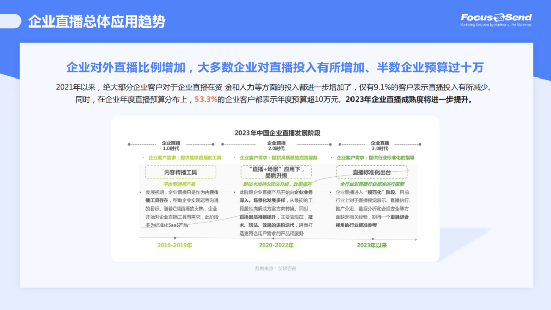 2021年以来,绝大部分企业客户对于企业直播在资金和人力等方面的投入都进一步增加了,仅有9.1%的客户表示直播投入有所减少。同时,在企业年度直播预算分布上,53.3%的企业客户都表示年度预算超10万元。2023年企业直播成熟度将进一步提升。