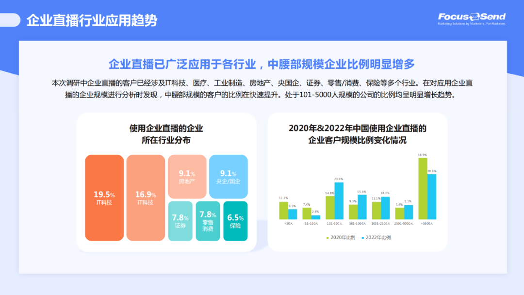 企业直播已广泛应用于各行业,中腰部规模企业比例明显增多
