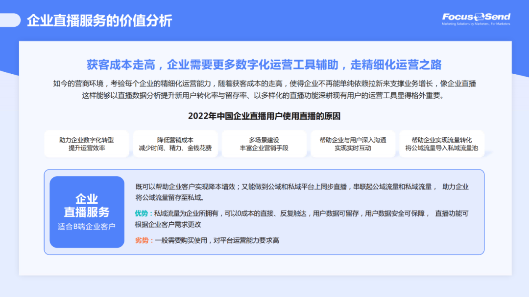 如今的营商环境,考验每个企业的精细化运营能力,随着获客成本的走高,使得企业不再能单纯依赖拉新来支撑业务增长,像企业直播这样能够以直播数据分析提升新用户转化率与留存率、以多样化的直播功能深耕现有用户的运营工具显得格外重要。
