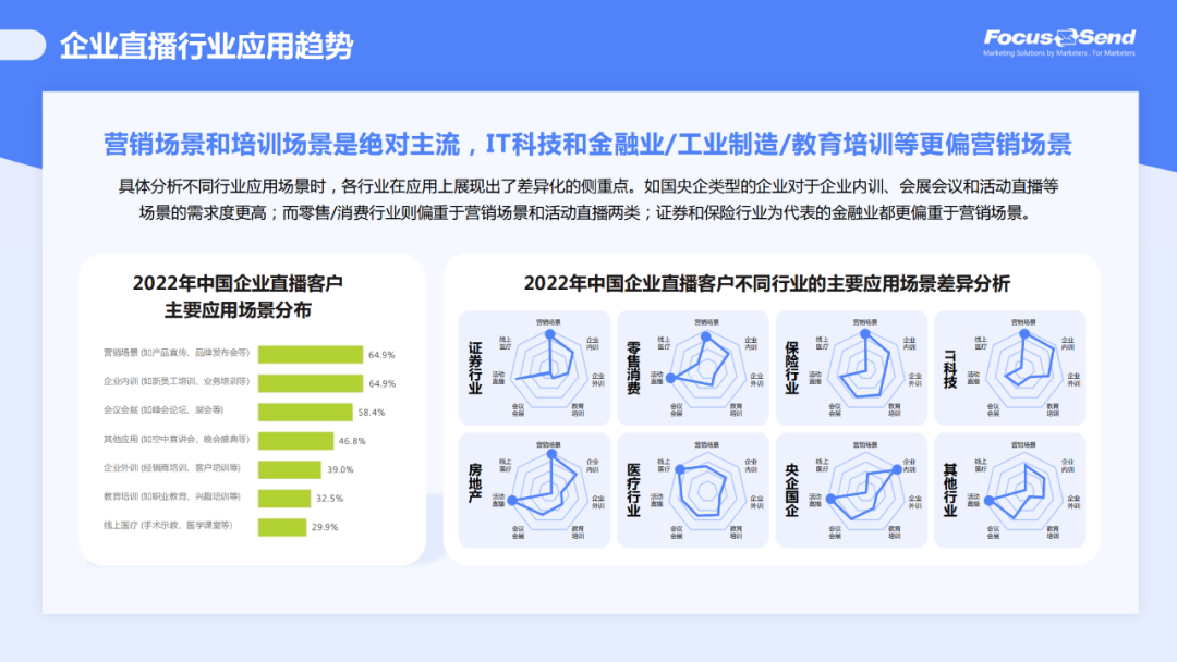 具体分析不同行业应用场景时,各行业在应用上展现出了差异化的侧重点。如国央企类型的企业对于企业内训、会展会议和活动直播等场景的需求度更高;而零售/消费行业则偏重于营销场景和活动直播两类;证券和保险行业为代表的金融业都更偏重于营销场景。