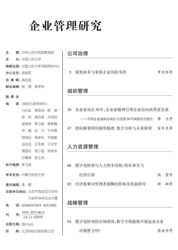 【摘 要】企业的风险承担是企业家精神的微观反映。搜集整理了控股家族创始人和重要家族成员的姓名等相关信息,将企业划分为有较高声誉维护动机的家族命名的家族企业和有较低声誉维护动机的非家族命名的家族企业,从社会情感财富视角研究家族命名会如何影响企业的风险承担水平。结果发现,家族命名显著降低了企业的风险承担水平,且这一负面影响关系在存在家族成员涉入管理、家族股权中仅有核心家族成员参与时表现得更强。此外,家族命名的上述影响主要表现为抑制了企业的投资水平、股权质押、战略激进度等实际的风险行为,家族命名对企业风险承担水平的抑制作用主要体现在成立时间较短的企业中,家族命名也会显著提升企业的慈善捐赠水平。最后,还发现家族命名方式在子公司的使用范围也会负向影响企业的风险承担水平。研究结论有助于加深对家族企业风险承担行为的认识与理解,对如何更好地鼓励和发挥民营家族企业的企业家精神具有启发意义。【关 键 词】家族命名;家族企业;风险承担;家族管理涉入;家族股权结构