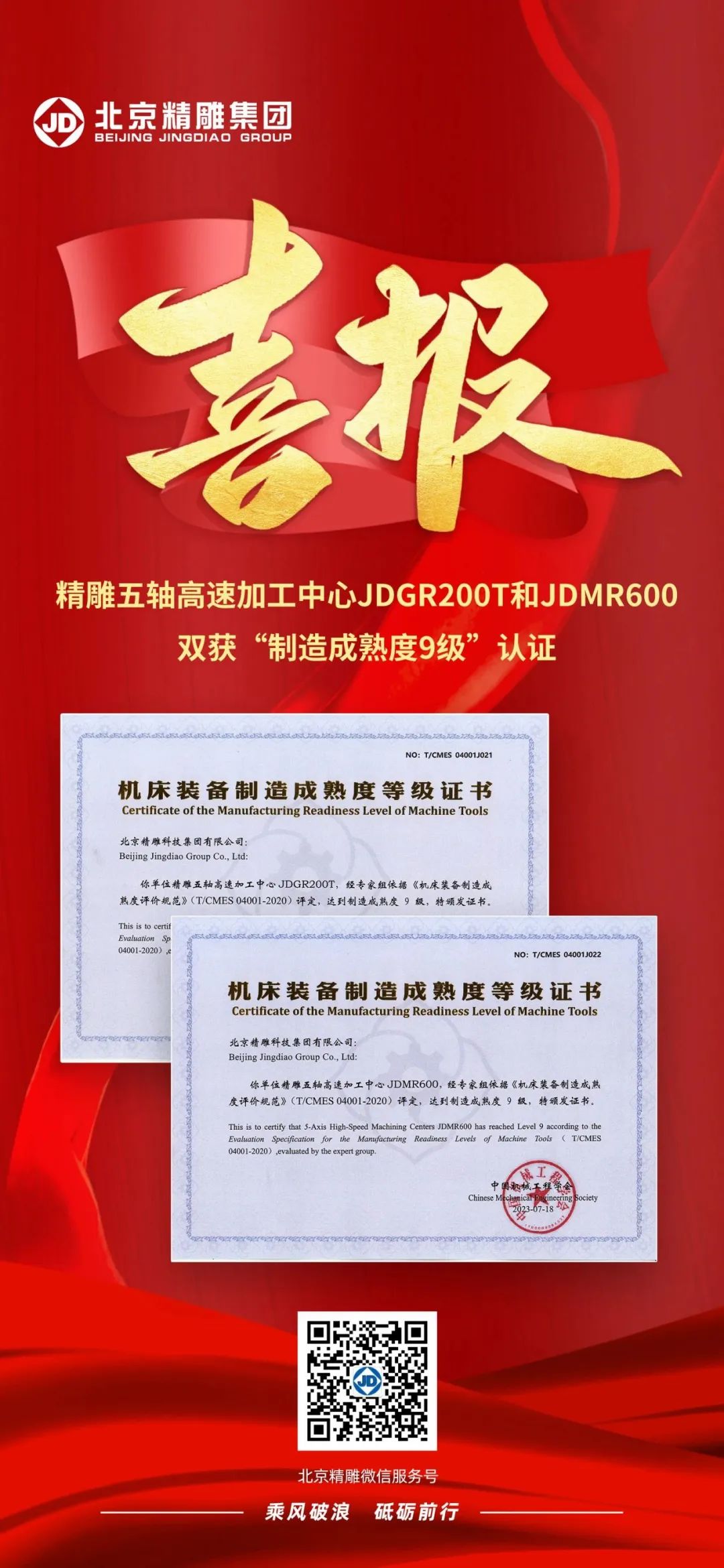 这是继“2021年,精雕五轴高速加工中心JDGR400T获‘制造成熟度八级’认证,成为我国采用《机床装备制造成熟度评价规范》进行评价认定的具有自主可控技术和批量生产能力的首台机床”之后,北京精雕又创下的“国内首次两台机床同时获得成熟度9级认证”的新记录,标志着JDGR200T和JDMR600的技术成熟度与可靠性均达到了行业的先进水平,并具备批量化生产能力。