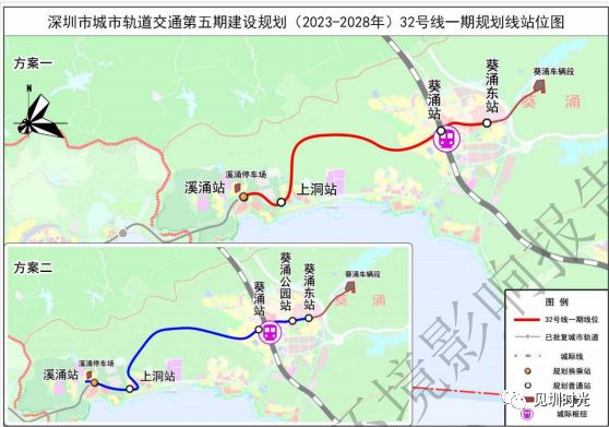 2)线路概况:方案一:32 号线一期起自溪涌站,终至葵涌东站,线路全长约 9.4 公里,设站 3 座,全地下敷设。方案二:32 号线一期起自溪涌站,终至葵涌东站,线路全长约 9.5 公里,设站 5 座,除溪涌站外,其他为高架车站。(根据各类招标信息了解,最终采用的为方案一)