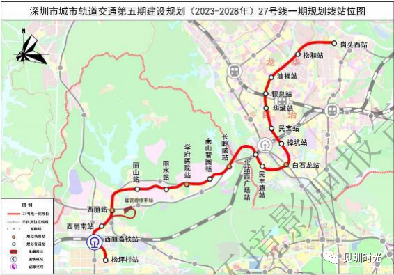 深圳市城市轨道交通27号线一期为服务科技园、西丽、龙华的普速线路,强化沿线人口岗位密集区的轨道交通服务,支持坂雪岗科技城、深圳北站中心、南山科技园等重点片区发展,服务西丽枢纽客流集疏运。线路起自松坪南站,终至岗头西站,线路全长23.2km,新建设停车场一座,总投资约227.38亿元(不包含同步实施工程的投资)(工程费暂估约130.18亿元)。