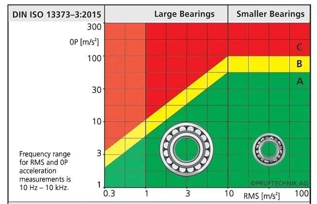 已经颁布的国际标准ISO 13373-3,可以通过加速度对滚动轴承进行定量的评估了。该国际标准亦被标称为DIN ISO 13373-3(标准的详细介绍请参看该标准的具体内容)。无论是便携式测量或在线项目,测量10Hz到10KHz的RMS值和峰值,可以定量判断滚动轴承的状态。对于慢速轴承(如风力发电机的主轴承),也可以很好的使用该标准,只需在图表中将特征线稍外移即可。下图是基于此创建的。从0.3到1 m/s2(RMS)覆盖的区域属于外扩的范围。