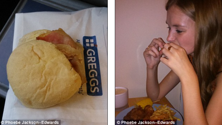 挑战开始的第一天,她早餐吃了一份培根三明治;午餐吃了一个麦当劳巨无霸+1杯可乐;晚餐是肯德基Mighty Bucket。第二天:Phoebe吃了一份香肠鸡蛋三明治;午餐是汉堡王大餐;晚饭吃了烤羊肉串;早餐是汉堡王鸡蛋和培根松饼;午餐是鸡肉店汉堡包套餐配可乐;晚餐是炸薯条和豌豆泥、鸡扒。第四天,她早餐吃了麦当劳的鸡蛋和香肠;午餐吃了辛辣意大利三明治配可乐;晚餐吃了鸡肉蘑菇肉馅饼;
