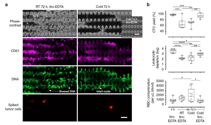微流微柱富集:该类芯片基于CTC 与血细胞生化特性的差异,在芯片中设置微柱阵列将其从血液中分离出来。此类芯片以CTC-Chip 为代表,该芯片是第一个使用流体技术富集CTC的装置。CTC-Chip 由78.000 微柱阵列组成,微柱被识别EpCAM 的抗体包被,微柱的几何排列和流体流速被优化以促进细胞附着到抗体包被的柱上。目前用于CTC 检测和表征的技术严重依赖于免疫细胞化学和需要高分辨率成像的其他技术,这在非透明三维微柱阵列的存在下是困难的。