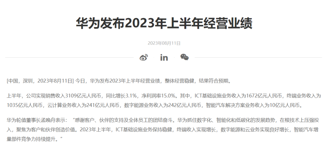 8月11日,华为公布了2023上半年的经营业绩,数据显示实现营收为3109亿人民币,同比增长了3.1%,净利润率为15%。
