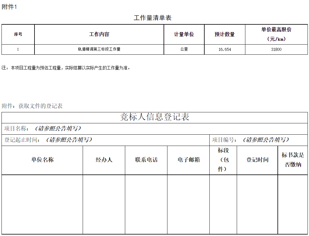 2.2最高限价:最高单价31800元/公里(含税),最高总价限价529597.2元(含税)。项目单价包含竞标人的安全防护用品、保险费、体检费、人工费、房租水电费用、交通费,现场调查配合、材料装卸转运、工机具转运及看守、生产必需的工机具(包含“0”级道尺、机动扳手、改锚机、起拨道器、方枕器等)、生产必须的油料费、管理费、税金等。