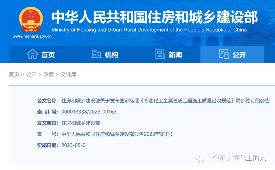 现批准国家标准《石油化工金属管道工程施工质量验收规范》(GB50517-2010)局部修订的条文,自2023年5月1日起实施。经此次修订的原条文同时废止。