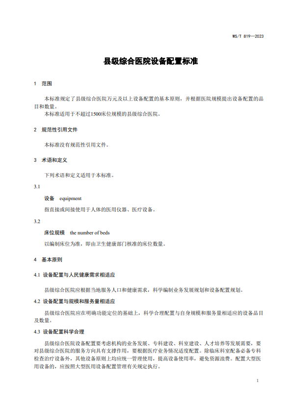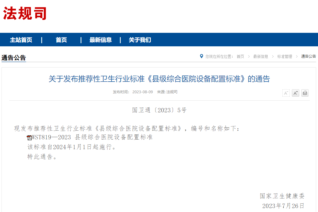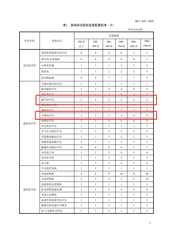 国家卫健委《县级综合医院设备配置标准》通告:超声波治疗仪、中频电疗仪为县级综合医院配置标准