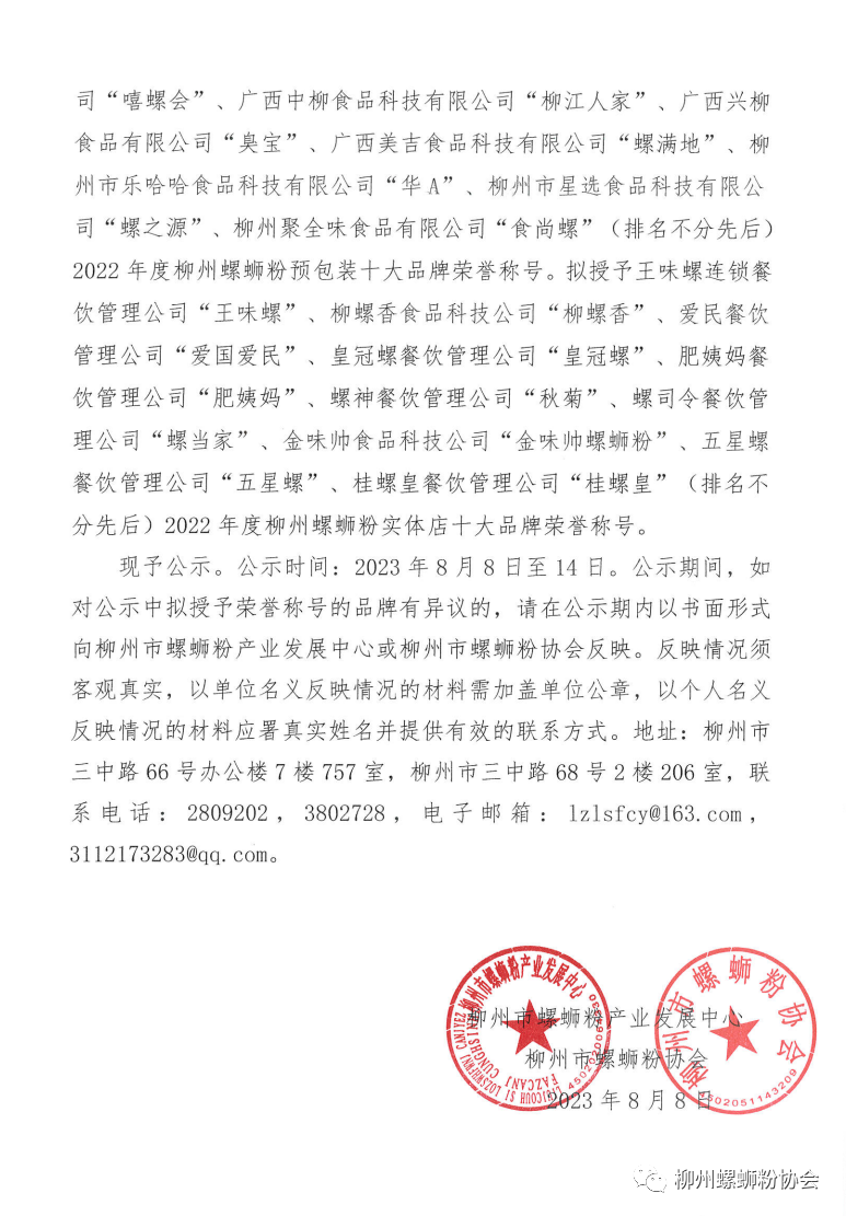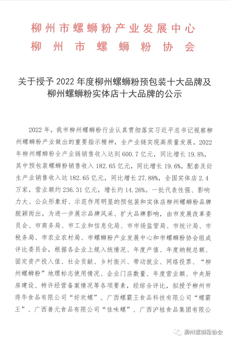关于授予2022年度柳州螺蛳粉预包装十大品牌及柳州螺蛳粉实体店十大品牌的公示