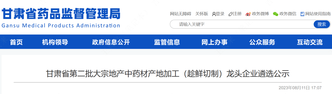 2023年08月11日,甘肃药监局发布了《第二批大宗地产中药材产地加工(趁鲜切制)龙头企业遴选公示》,共涉及25家企业入围,公示期截止2023年8月18日。