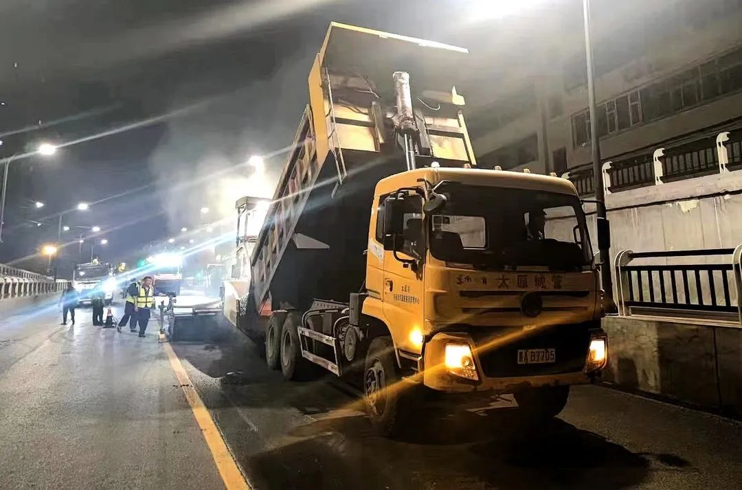 为了保证夜间施工安全,该站驾驶员统一身着工衣及反光背心,车辆全部打开双闪给予警示。施工中,由于辅路道路狭窄且距离较长,运输车辆只能单次倒车进入,全力配合摊铺机施工作业,在大家的密切配合下,圆满完成了迎春街养护任务。