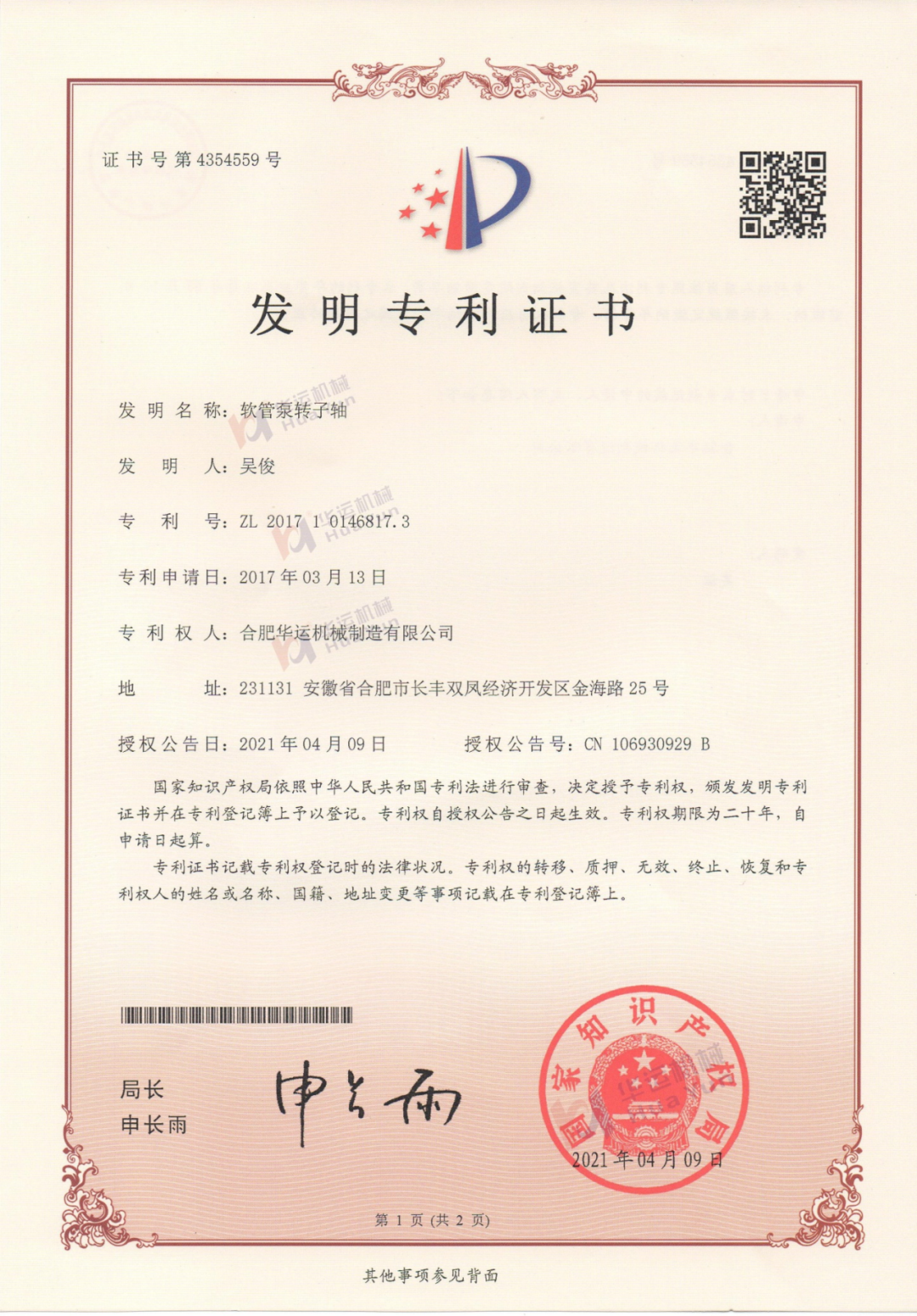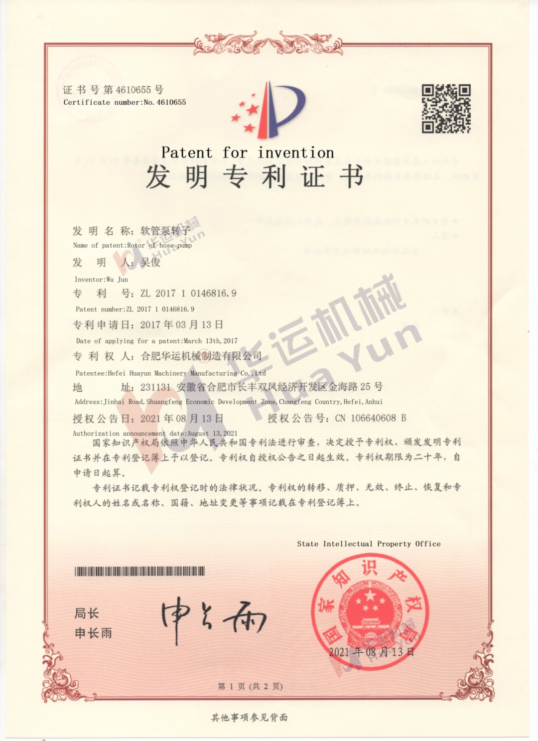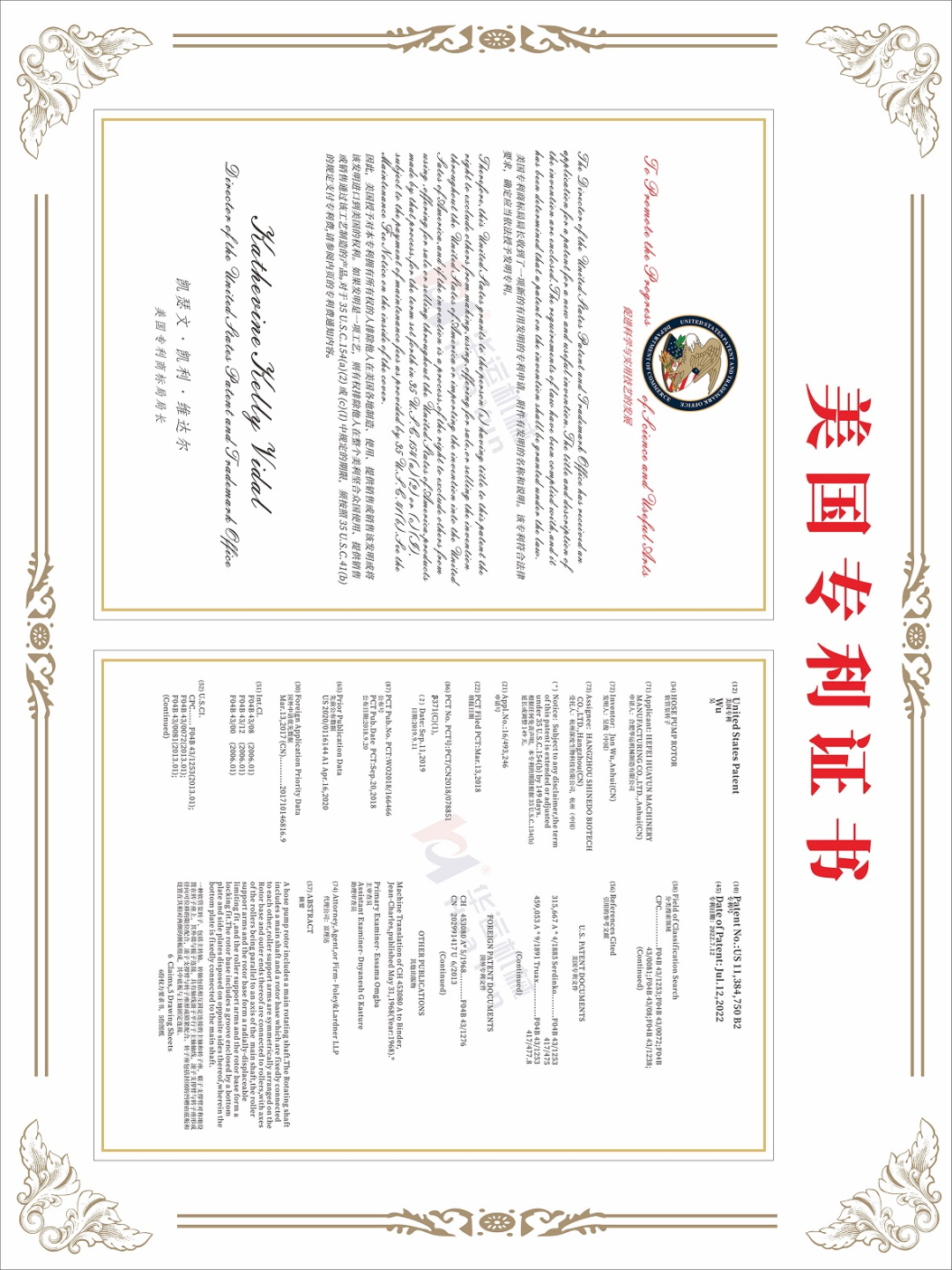 Z 型软管泵拥有十七项中国专利(发明专利号:Z20171 0146816.9;ZL201710146817.3),美国发明专利一项(发明专利号:US 11,384,750 B2)。在美国、印度设有全资子公司,产品远销世界80多个国家和地区。