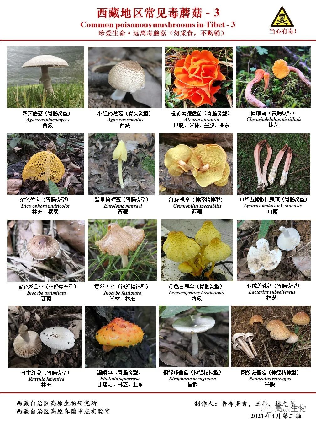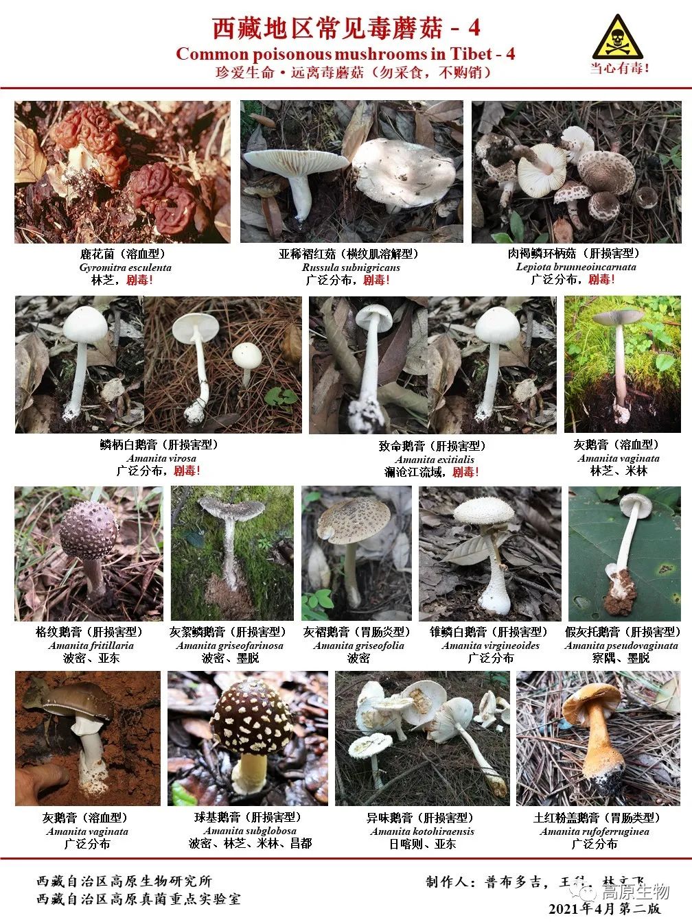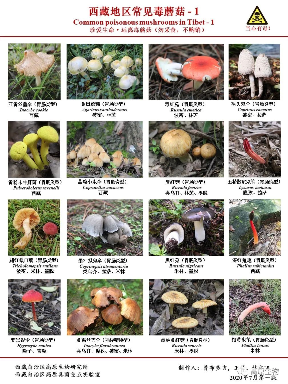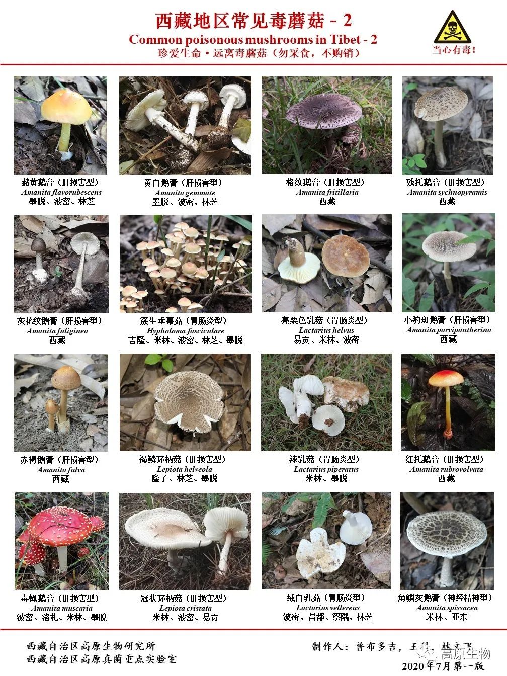 以致命鹅膏、毒蝇鹅膏、肉褐鳞环柄菇、亚稀褶红菇等为代表的的毒蘑菇,可对人体造成肠胃炎、致幻、横纹肌溶解、肾衰竭、溶血等多种病症,若未能及时采取有效救助措施可导致死亡。食用菌是人类膳食结构的重要组成部分,在各个野生菌产区,当地居民多有采食野生菌的习惯,因真菌种类繁多、大部分物种仅凭肉眼难以准确鉴别,由此造成我国每年发生数百起因误食毒蘑菇而中毒的事件。据中国疾病预防控制中心不完全统计,近10年来,我国误食野生蘑菇中毒例数占全国食物中毒总例数的12%,死亡人数占35%,也就是说,我国食物安全中毒事件中1/3的死亡是由误食毒蘑菇导致的,毒蘑菇已成为我国食物中毒的“头号杀手”。西藏地区每年也存在误食毒蘑菇而发生的生命安全隐患,近年来西藏自治区高原生物研究所,西藏自治区高原真菌重点实验室每一年发布和更新西藏地区毒蘑菇挂图,为西藏地区群众的生命安全保驾护航。