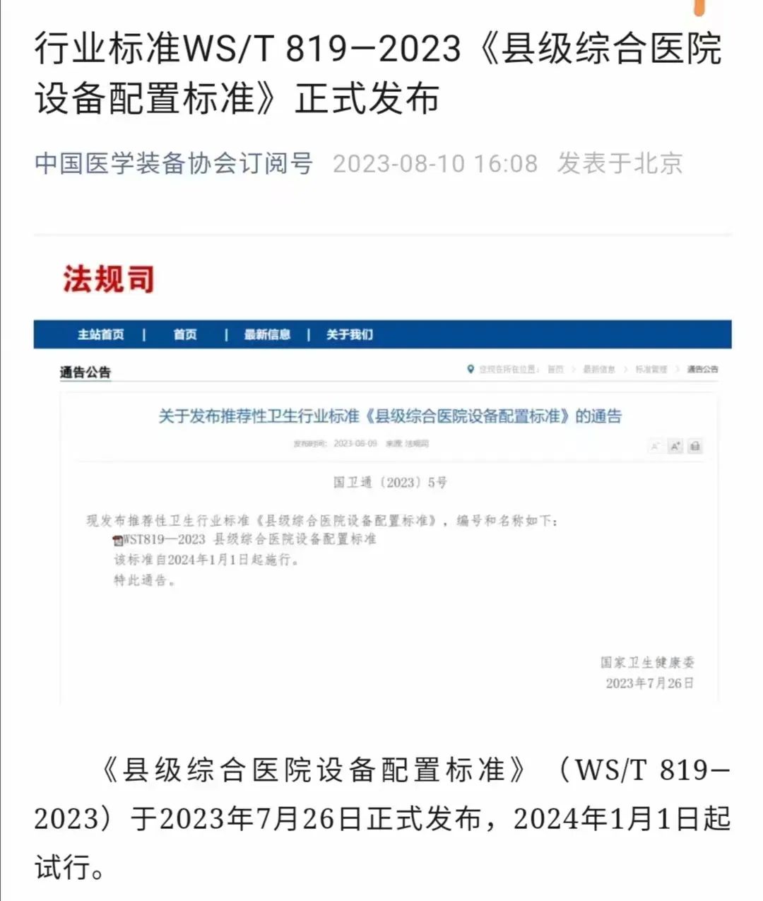 现发布推荐性卫生行业标准《县级综合医院设备配置标准》,编号和名称如下: