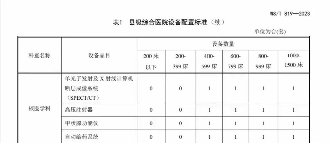 《县级综合医院设备配置标准》2023年7月26日发布,自2024年1月1日起实施。本标准规定了超过400床位规模的县级综合医院核医学科应配置SPECT/CT等设备。本标准规定了设备配置数量的最低标准,各县级综合医院可根据规模和服务需求合理配置。