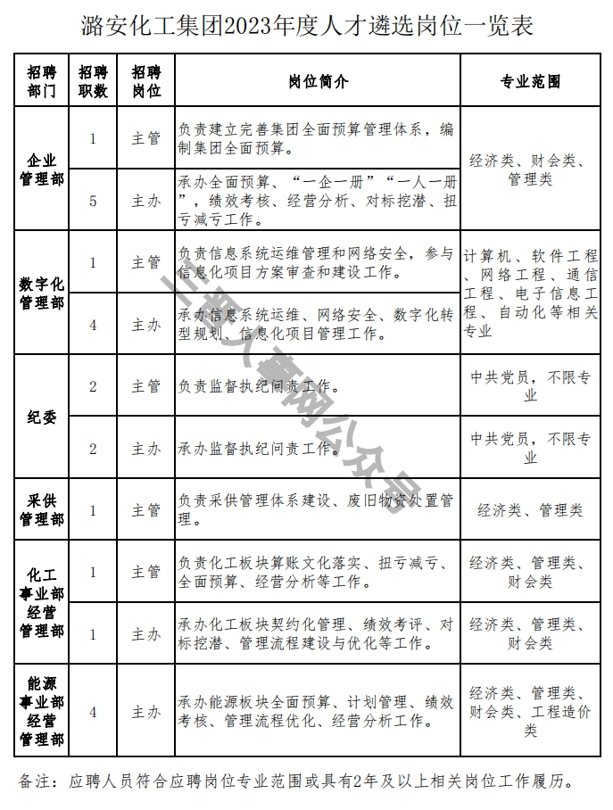 潞安化工集团2023年总部、事业部管理人员公开遴选公告(22人)