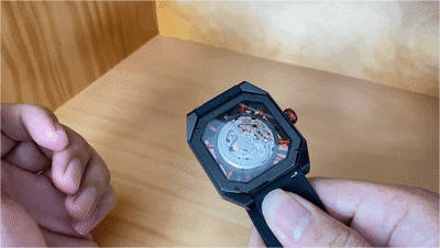 这里给大家演示一下抗震效果 当手表重击手掌后,陀飞轮快速旋转,可以明显看到整个手表在弹簧的作用下 左右晃动感,就像汽车的一个避震器缓冲的效果