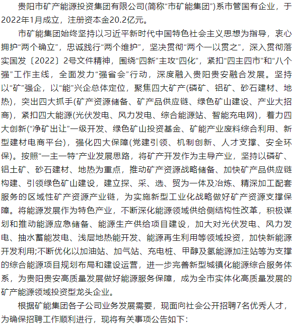 贵阳 | 市矿产能源投资集团有限公司2023年第一批校园招聘7名工作人员(报名时间:8月8日至15日)