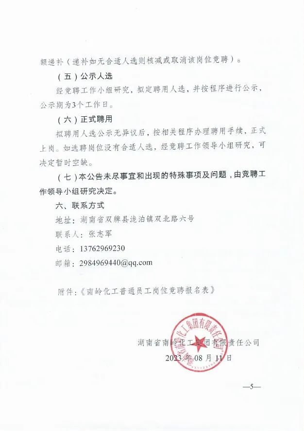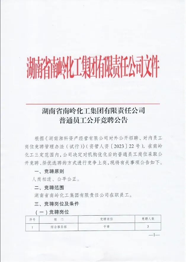 湖南省南岭化工集团有限责任公司普通员工公开竞聘公告
