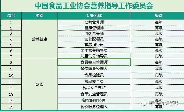 其它工种:食品安全管理师、公共营养师、健康管理师、餐饮服务经理人、营养配餐师